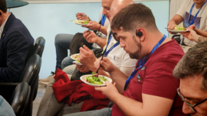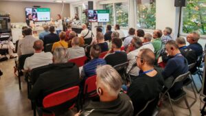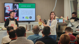 A continuación, Viviana Romanazzi, responsable de los consorcios, estuvo a cargo de la parte teórica de la jornada. Durante su intervención explicó que el objetivo de este taller sobre DOP e IGP es promover tanto el sector de la charcutería como los distintivos de calidad europeos entre los profesionales y los consumidores. Además, detalló las particularidades y diferencias entre los productos DOP e IGP, subrayando el papel destacado que desempeña Italia dentro del conjunto de embutidos con estos sellos en Europa. Como su intervención fue en italiano, una intérprete realizó la traducción simultánea para que nuestros invitados pudieran comprender perfectamente su exposición.